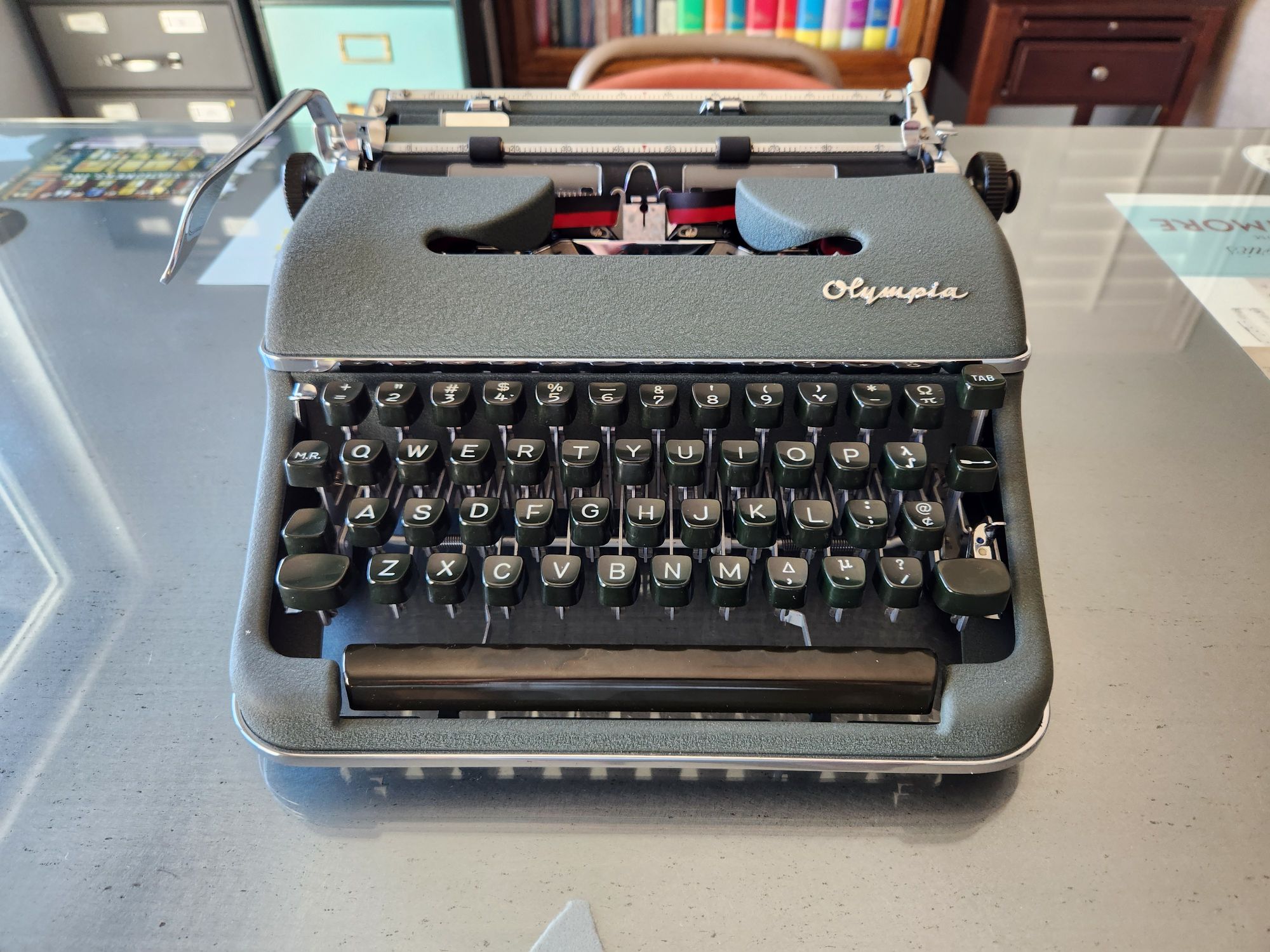 On Saturday, August 3rd, after a patience-trying wait, I picked up this lovely green 1958 Olympia SM3. It’s the first typewriter in my collection with both an exotic character set as well as a typeface that veers outside of the standard pica and elite typefaces.